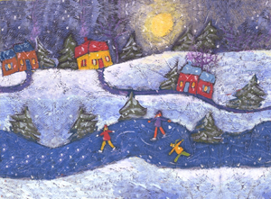 Youngsters enjoy skating through town on a frozen meandering stream in this original painting by Mark, Age 10.