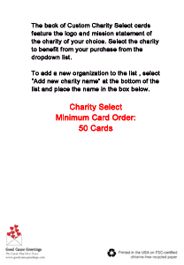 20% of the purchase price benefits the charity of your choice. E-mail proofs of both the inside and the back of the card will be provided on all Custom Birthday Cards ordered. 50 CARD MINIMUM on all Custom Birthday Card Orders. Cards where you select the charity to support are considered Custom Card Orders.