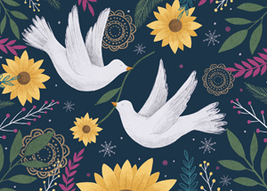 Doves of Peace frolic amid Sunflowers, the state flower of Ukraine, in this original holiday card created by Pennsylvania artist Meg Auchenbach. Proceeds support the people of Ukraine in their time of crisis.