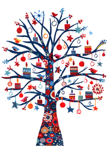 An assortment of exquisetly detailed holiday symbols deck the branches of this original painting exclusive to Good Cause Greetings. Recycled paper. Made in the USA.
